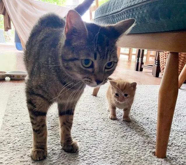 有一天,女士出门几天,回来时发现茉茉已经生下了小猫。可惜,只有一只小猫活了下来,那就是团子。团子小小的,毛茸茸的,紧紧挨着妈妈,像个小暖炉。女士看在眼里,马上决定不能让这对母子继续在外面受苦。她把茉茉和团子带进家里,还联系了流浪猫俱乐部的志愿者。